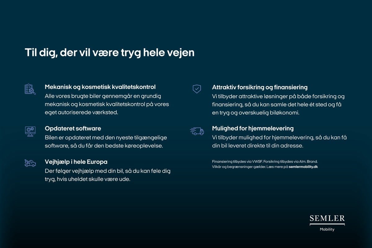 Fabriksmonteret udstyr: ✔️ Træthedsregistrering ✔️ Fuldaut. Klima ✔️ Elektrisk Kabinevarmer ✔️ Adaptiv fartpilot ✔️ Nøglefri Betjening ✔️ Sædevarme ✔️ Regnsensor ✔️ Bakkameraet Rear View ✔️ El-Spejle M/Varme ✔️ Parkeringssensor (For og bag) ✔️ Elektrisk Parkeringsbremse ✔️ Dab+ Radio ✔️ Multifunktionsrat ✔️ Bluetooth ✔️ Android Auto ✔️ Apple Carplay ✔️ Digitalt Cockpit ✔️ Fløjdøre bagpå, uden ruder ✔️ Fuld Led Forlygter ✔️ Fjernlysassistent ✔️ Automatisk Lys ✔️ Elektrisk frigivet træk